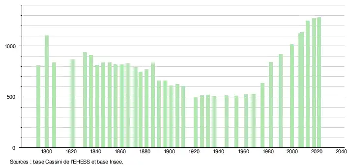 L'évolution du nombre d'habitants est connue à travers les recensements de la population effectués dans la commune depuis 1793. Pour les communes de moins de 10 000 habitants, une enquête de recensement portant sur toute la population est réalisée tous les cinq ans, les populations légales des années intermédiaires étant quant à elles estimées par interpolation ou extrapolation[27]. Pour la commune, le premier recensement exhaustif entrant dans le cadre du nouveau dispositif a été réalisé en 2007[28].