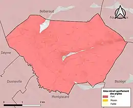 Le retrait-gonflement des sols argileux est susceptible d'engendrer des dommages importants aux bâtiments en cas d’alternance de périodes de sécheresse et de pluie. 98,1 % de la superficie communale est en aléa moyen ou fort (88,8 % au niveau départemental et 48,5 % au niveau national). Sur les 597 bâtiments dénombrés sur la commune en 2019, 593 sont en aléa moyen ou fort, soit 99 %, à comparer aux 98 % au niveau départemental et 54 % au niveau national. Une cartographie de l'exposition du territoire national au retrait gonflement des sols argileux est disponible sur le site du BRGM[24],[Carte 3].