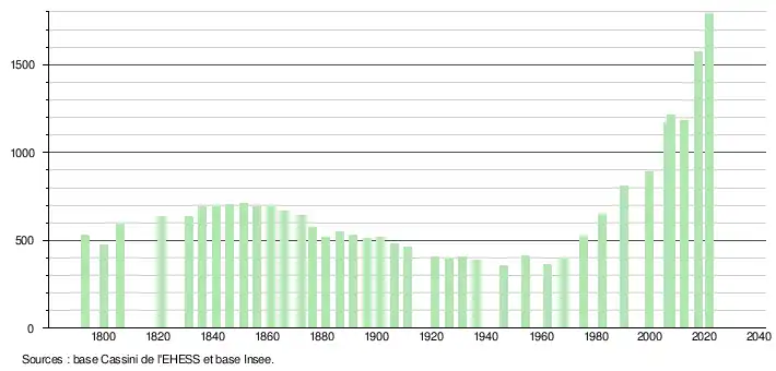 L'évolution du nombre d'habitants est connue à travers les recensements de la population effectués dans la commune depuis 1793. Pour les communes de moins de 10 000 habitants, une enquête de recensement portant sur toute la population est réalisée tous les cinq ans, les populations légales des années intermédiaires étant quant à elles estimées par interpolation ou extrapolation[29]. Pour la commune, le premier recensement exhaustif entrant dans le cadre du nouveau dispositif a été réalisé en 2007[30].