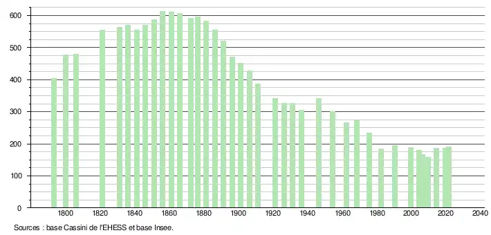 L'évolution du nombre d'habitants est connue à travers les recensements de la population effectués dans la commune depuis 1793. Pour les communes de moins de 10 000 habitants, une enquête de recensement portant sur toute la population est réalisée tous les cinq ans, les populations légales des années intermédiaires étant quant à elles estimées par interpolation ou extrapolation[24]. Pour la commune, le premier recensement exhaustif entrant dans le cadre du nouveau dispositif a été réalisé en 2004[25].