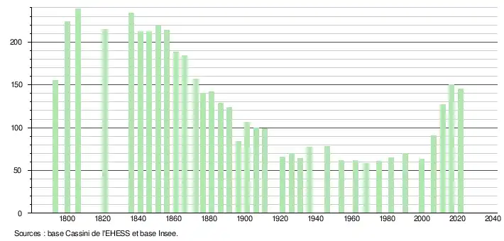 L'évolution du nombre d'habitants est connue à travers les recensements de la population effectués dans la commune depuis 1793. Pour les communes de moins de 10 000 habitants, une enquête de recensement portant sur toute la population est réalisée tous les cinq ans, les populations légales des années intermédiaires étant quant à elles estimées par interpolation ou extrapolation[13]. Pour la commune, le premier recensement exhaustif entrant dans le cadre du nouveau dispositif a été réalisé en 2006[14].