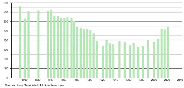 L'évolution du nombre d'habitants est connue à travers les recensements de la population effectués dans la commune depuis 1793. Pour les communes de moins de 10 000 habitants, une enquête de recensement portant sur toute la population est réalisée tous les cinq ans, les populations légales des années intermédiaires étant quant à elles estimées par interpolation ou extrapolation[34]. Pour la commune, le premier recensement exhaustif entrant dans le cadre du nouveau dispositif a été réalisé en 2006[35].