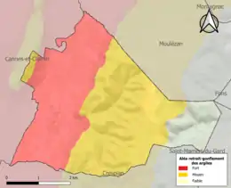 Le retrait-gonflement des sols argileux est susceptible d'engendrer des dommages importants aux bâtiments en cas d’alternance de périodes de sécheresse et de pluie. 89,7 % de la superficie communale est en aléa moyen ou fort (67,5 % au niveau départemental et 48,5 % au niveau national). Sur les 171 bâtiments dénombrés sur la commune en 2019, 171 sont en aléa moyen ou fort, soit 100 %, à comparer aux 90 % au niveau départemental et 54 % au niveau national. Une cartographie de l'exposition du territoire national au retrait gonflement des sols argileux est disponible sur le site du BRGM[15],[Carte 2].