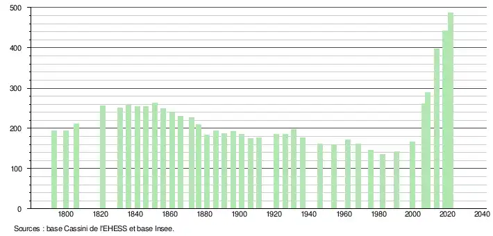 L'évolution du nombre d'habitants est connue à travers les recensements de la population effectués dans la commune depuis 1793. Pour les communes de moins de 10 000 habitants, une enquête de recensement portant sur toute la population est réalisée tous les cinq ans, les populations légales des années intermédiaires étant quant à elles estimées par interpolation ou extrapolation[21]. Pour la commune, le premier recensement exhaustif entrant dans le cadre du nouveau dispositif a été réalisé en 2008[22].