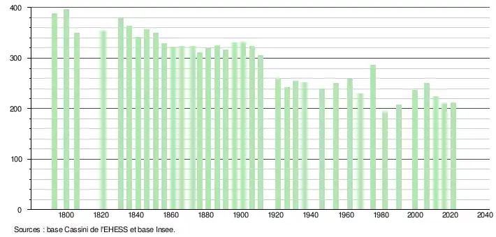 L'évolution du nombre d'habitants est connue à travers les recensements de la population effectués dans la commune depuis 1793. Pour les communes de moins de 10 000 habitants, une enquête de recensement portant sur toute la population est réalisée tous les cinq ans, les populations légales des années intermédiaires étant quant à elles estimées par interpolation ou extrapolation[22]. Pour la commune, le premier recensement exhaustif entrant dans le cadre du nouveau dispositif a été réalisé en 2006[23].