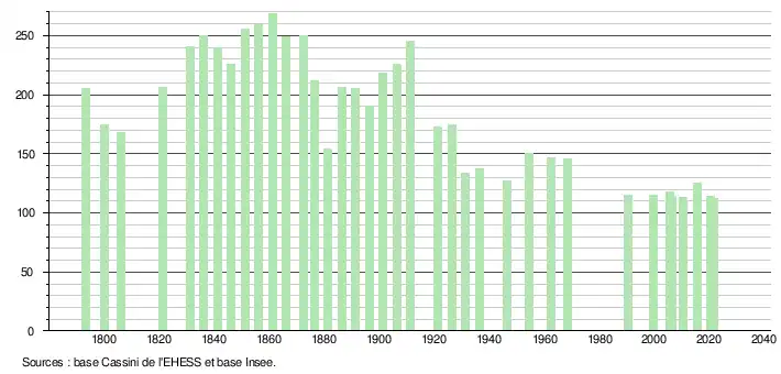 L'évolution du nombre d'habitants est connue à travers les recensements de la population effectués dans la commune depuis 1793. Pour les communes de moins de 10 000 habitants, une enquête de recensement portant sur toute la population est réalisée tous les cinq ans, les populations légales des années intermédiaires étant quant à elles estimées par interpolation ou extrapolation[14]. Pour la commune, le premier recensement exhaustif entrant dans le cadre du nouveau dispositif a été réalisé en 2005[15].
