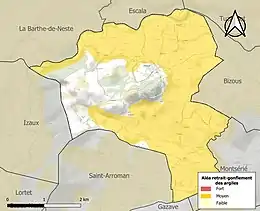 Le retrait-gonflement des sols argileux est susceptible d'engendrer des dommages importants aux bâtiments en cas d’alternance de périodes de sécheresse et de pluie. 72,6 % de la superficie communale est en aléa moyen ou fort (44,5 % au niveau départemental et 48,5 % au niveau national). Sur les 146 bâtiments dénombrés sur la commune en 2019, 112 sont en aléa moyen ou fort, soit 77 %, à comparer aux 75 % au niveau départemental et 54 % au niveau national. Une cartographie de l'exposition du territoire national au retrait gonflement des sols argileux est disponible sur le site du BRGM[39],[Carte 3].