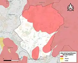 Le retrait-gonflement des sols argileux est susceptible d'engendrer des dommages importants aux bâtiments en cas d’alternance de périodes de sécheresse et de pluie. 56,1 % de la superficie communale est en aléa moyen ou fort (54,2 % au niveau départemental et 48,5 % au niveau national). Sur les 395 bâtiments dénombrés sur la commune en 2019, 255 sont en aléa moyen ou fort, soit 65 %, à comparer aux 57 % au niveau départemental et 54 % au niveau national. Une cartographie de l'exposition du territoire national au retrait gonflement des sols argileux est disponible sur le site du BRGM[13],[Carte 2].