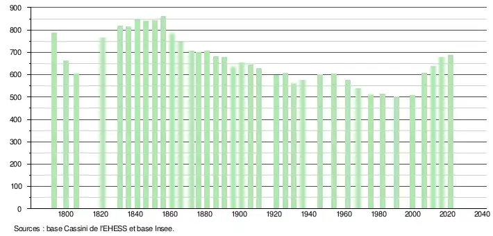 L'évolution du nombre d'habitants est connue à travers les recensements de la population effectués dans la commune depuis 1793. Pour les communes de moins de 10 000 habitants, une enquête de recensement portant sur toute la population est réalisée tous les cinq ans, les populations légales des années intermédiaires étant quant à elles estimées par interpolation ou extrapolation[17]. Pour la commune, le premier recensement exhaustif entrant dans le cadre du nouveau dispositif a été réalisé en 2006[18].