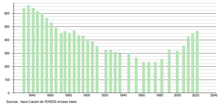 L'évolution du nombre d'habitants est connue à travers les recensements de la population effectués dans la commune depuis 1831. Pour les communes de moins de 10 000 habitants, une enquête de recensement portant sur toute la population est réalisée tous les cinq ans, les populations légales des années intermédiaires étant quant à elles estimées par interpolation ou extrapolation[33]. Pour la commune, le premier recensement exhaustif entrant dans le cadre du nouveau dispositif a été réalisé en 2006[34].