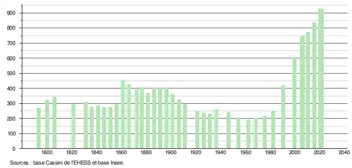 L'évolution du nombre d'habitants est connue à travers les recensements de la population effectués dans la commune depuis 1793. Pour les communes de moins de 10 000 habitants, une enquête de recensement portant sur toute la population est réalisée tous les cinq ans, les populations légales des années intermédiaires étant quant à elles estimées par interpolation ou extrapolation[19]. Pour la commune, le premier recensement exhaustif entrant dans le cadre du nouveau dispositif a été réalisé en 2005[20].