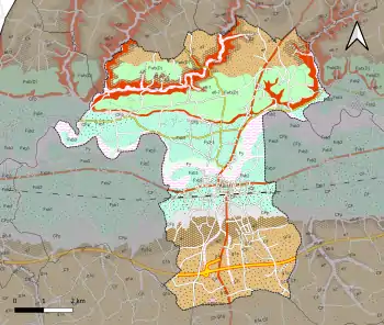 L'occupation des sols de la commune, telle qu'elle ressort de la base de données européenne d’occupation biophysique des sols Corine Land Cover (CLC), est marquée par l'importance des territoires agricoles (44,2 % en 2018), néanmoins en diminution par rapport à 1990 (53,7 %). La répartition détaillée en 2018 est la suivante : forêts (37,5 %), zones agricoles hétérogènes (31,8 %), zones urbanisées (13,1 %), terres arables (8 %), prairies (4,4 %), eaux continentales[Note 6] (3,1 %), mines, décharges et chantiers (0,8 %), zones industrielles ou commerciales et réseaux de communication (0,6 %), milieux à végétation arbustive et/ou herbacée (0,6 %)[42]. L'évolution de l’occupation des sols de la commune et de ses infrastructures peut être observée sur les différentes représentations cartographiques du territoire : la carte de Cassini (XVIIIe siècle), la carte d'état-major (1820-1866) et les cartes ou photos aériennes de l'IGN pour la période actuelle (1950 à aujourd'hui)[Carte 3].