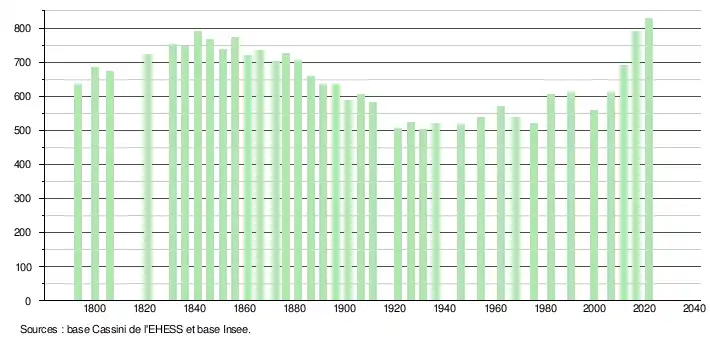 L'évolution du nombre d'habitants est connue à travers les recensements de la population effectués dans la commune depuis 1793. Pour les communes de moins de 10 000 habitants, une enquête de recensement portant sur toute la population est réalisée tous les cinq ans, les populations légales des années intermédiaires étant quant à elles estimées par interpolation ou extrapolation[32]. Pour la commune, le premier recensement exhaustif entrant dans le cadre du nouveau dispositif a été réalisé en 2006[33].