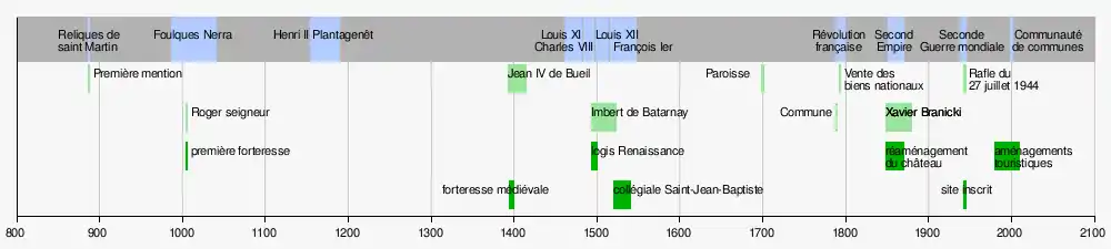 Son histoire se confond en grande partie avec celle de son château, construit au début du XIe siècle à l'extrémité d'un éperon rocheux surplombant la vallée de l'Indrois et plusieurs fois rebâti ou remanié depuis. C'est à ses pieds que s'est édifié le bourg, d'abord simple lieu-dit de la commune voisine de Beaumont-Village, érigé en paroisse en 1700 seulement, autour de la collégiale Saint-Jean-Baptiste, et devenu commune à la Révolution française.