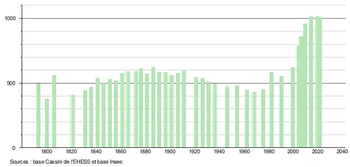 L'évolution du nombre d'habitants est connue à travers les recensements de la population effectués dans la commune depuis 1793. Pour les communes de moins de 10 000 habitants, une enquête de recensement portant sur toute la population est réalisée tous les cinq ans, les populations légales des années intermédiaires étant quant à elles estimées par interpolation ou extrapolation[22]. Pour la commune, le premier recensement exhaustif entrant dans le cadre du nouveau dispositif a été réalisé en 2004[23].