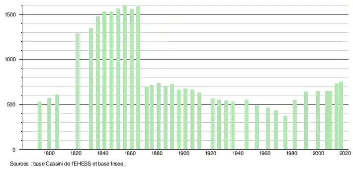 L'évolution du nombre d'habitants est connue à travers les recensements de la population effectués dans la commune depuis 1793. Pour les communes de moins de 10 000 habitants, une enquête de recensement portant sur toute la population est réalisée tous les cinq ans, les populations légales des années intermédiaires étant quant à elles estimées par interpolation ou extrapolation[8]. Pour la commune, le premier recensement exhaustif entrant dans le cadre du nouveau dispositif a été réalisé en 2008[9].