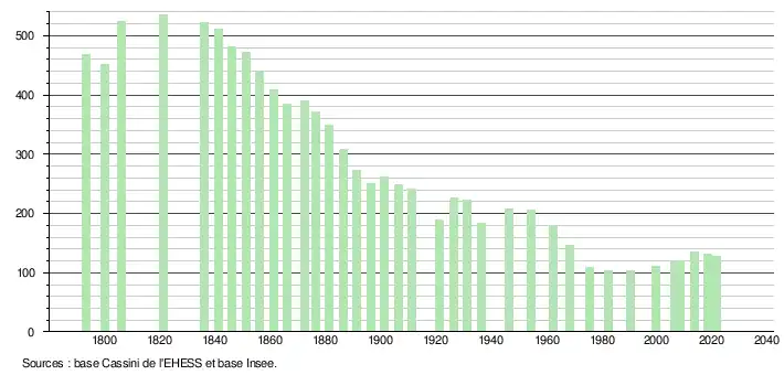 L'évolution du nombre d'habitants est connue à travers les recensements de la population effectués dans la commune depuis 1793. Pour les communes de moins de 10 000 habitants, une enquête de recensement portant sur toute la population est réalisée tous les cinq ans, les populations légales des années intermédiaires étant quant à elles estimées par interpolation ou extrapolation[20]. Pour la commune, le premier recensement exhaustif entrant dans le cadre du nouveau dispositif a été réalisé en 2008[21].