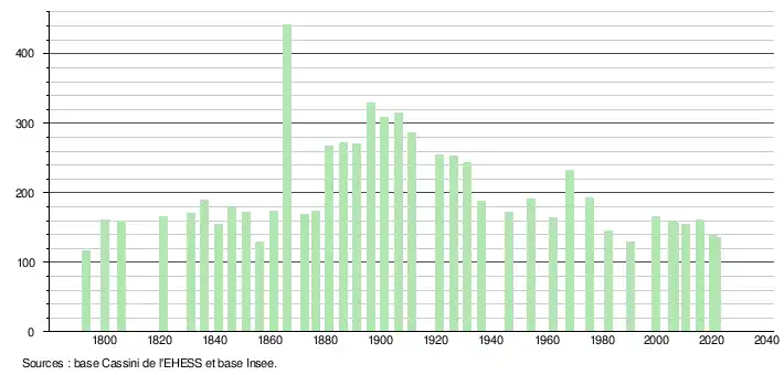 L'évolution du nombre d'habitants est connue à travers les recensements de la population effectués dans la commune depuis 1793. Pour les communes de moins de 10 000 habitants, une enquête de recensement portant sur toute la population est réalisée tous les cinq ans, les populations légales des années intermédiaires étant quant à elles estimées par interpolation ou extrapolation[15]. Pour la commune, le premier recensement exhaustif entrant dans le cadre du nouveau dispositif a été réalisé en 2005[16].