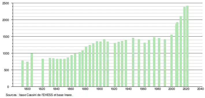 L'évolution du nombre d'habitants est connue à travers les recensements de la population effectués dans la commune depuis 1793. Pour les communes de moins de 10 000 habitants, une enquête de recensement portant sur toute la population est réalisée tous les cinq ans, les populations légales des années intermédiaires étant quant à elles estimées par interpolation ou extrapolation[19]. Pour la commune, le premier recensement exhaustif entrant dans le cadre du nouveau dispositif a été réalisé en 2007[20].