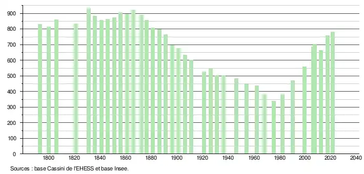 L'évolution du nombre d'habitants est connue à travers les recensements de la population effectués dans la commune depuis 1793. Pour les communes de moins de 10 000 habitants, une enquête de recensement portant sur toute la population est réalisée tous les cinq ans, les populations légales des années intermédiaires étant quant à elles estimées par interpolation ou extrapolation[24]. Pour la commune, le premier recensement exhaustif entrant dans le cadre du nouveau dispositif a été réalisé en 2007[25].