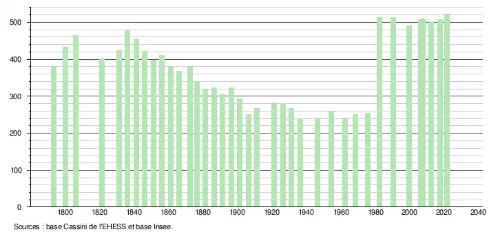 L'évolution du nombre d'habitants est connue à travers les recensements de la population effectués dans la commune depuis 1793. Pour les communes de moins de 10 000 habitants, une enquête de recensement portant sur toute la population est réalisée tous les cinq ans, les populations légales des années intermédiaires étant quant à elles estimées par interpolation ou extrapolation[24]. Pour la commune, le premier recensement exhaustif entrant dans le cadre du nouveau dispositif a été réalisé en 2007[25].