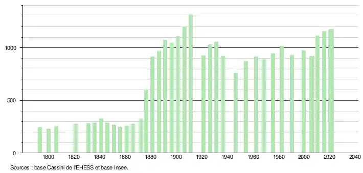 L'évolution du nombre d'habitants est connue à travers les recensements de la population effectués dans la commune depuis 1793. Pour les communes de moins de 10 000 habitants, une enquête de recensement portant sur toute la population est réalisée tous les cinq ans, les populations légales des années intermédiaires étant quant à elles estimées par interpolation ou extrapolation[30]. Pour la commune, le premier recensement exhaustif entrant dans le cadre du nouveau dispositif a été réalisé en 2005[31].