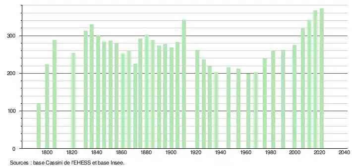 L'évolution du nombre d'habitants est connue à travers les recensements de la population effectués dans la commune depuis 1793. Pour les communes de moins de 10 000 habitants, une enquête de recensement portant sur toute la population est réalisée tous les cinq ans, les populations légales des années intermédiaires étant quant à elles estimées par interpolation ou extrapolation[19]. Pour la commune, le premier recensement exhaustif entrant dans le cadre du nouveau dispositif a été réalisé en 2006[20].