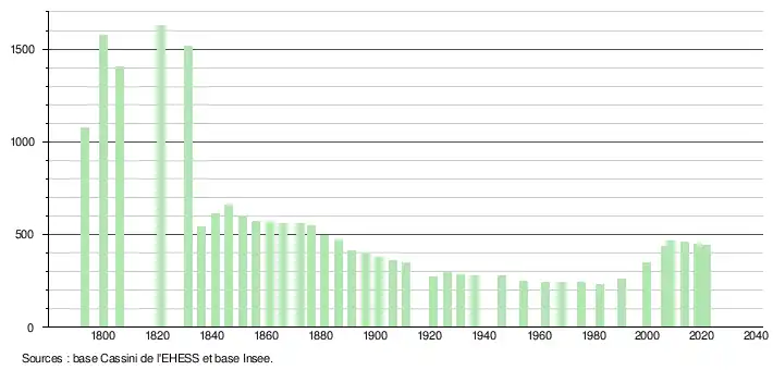 L'évolution du nombre d'habitants est connue à travers les recensements de la population effectués dans la commune depuis 1793. Pour les communes de moins de 10 000 habitants, une enquête de recensement portant sur toute la population est réalisée tous les cinq ans, les populations légales des années intermédiaires étant quant à elles estimées par interpolation ou extrapolation[20]. Pour la commune, le premier recensement exhaustif entrant dans le cadre du nouveau dispositif a été réalisé en 2008[21].