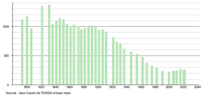 L'évolution du nombre d'habitants est connue à travers les recensements de la population effectués dans la commune depuis 1793. Pour les communes de moins de 10 000 habitants, une enquête de recensement portant sur toute la population est réalisée tous les cinq ans, les populations légales des années intermédiaires étant quant à elles estimées par interpolation ou extrapolation[23]. Pour la commune, le premier recensement exhaustif entrant dans le cadre du nouveau dispositif a été réalisé en 2005[24].