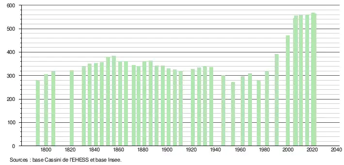 L'évolution du nombre d'habitants est connue à travers les recensements de la population effectués dans la commune depuis 1793. Pour les communes de moins de 10 000 habitants, une enquête de recensement portant sur toute la population est réalisée tous les cinq ans, les populations légales des années intermédiaires étant quant à elles estimées par interpolation ou extrapolation[22]. Pour la commune, le premier recensement exhaustif entrant dans le cadre du nouveau dispositif a été réalisé en 2005[23].