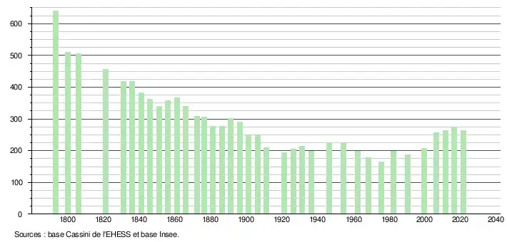 L'évolution du nombre d'habitants est connue à travers les recensements de la population effectués dans la commune depuis 1793. Pour les communes de moins de 10 000 habitants, une enquête de recensement portant sur toute la population est réalisée tous les cinq ans, les populations légales des années intermédiaires étant quant à elles estimées par interpolation ou extrapolation[35]. Pour la commune, le premier recensement exhaustif entrant dans le cadre du nouveau dispositif a été réalisé en 2006[36].