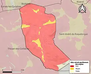 Le retrait-gonflement des sols argileux est susceptible d'engendrer des dommages importants aux bâtiments en cas d’alternance de périodes de sécheresse et de pluie. 97,4 % de la superficie communale est en aléa moyen ou fort (75,2 % au niveau départemental et 48,5 % au niveau national). Sur les 374 bâtiments dénombrés sur la commune en 2019, 374 sont en aléa moyen ou fort, soit 100 %, à comparer aux 94 % au niveau départemental et 54 % au niveau national. Une cartographie de l'exposition du territoire national au retrait gonflement des sols argileux est disponible sur le site du BRGM[27],[Carte 3].