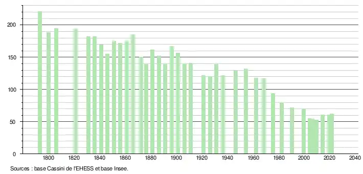 L'évolution du nombre d'habitants est connue à travers les recensements de la population effectués dans la commune depuis 1793. Pour les communes de moins de 10 000 habitants, une enquête de recensement portant sur toute la population est réalisée tous les cinq ans, les populations légales des années intermédiaires étant quant à elles estimées par interpolation ou extrapolation[33]. Pour la commune, le premier recensement exhaustif entrant dans le cadre du nouveau dispositif a été réalisé en 2004[34].