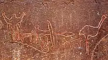 La station la plus importante est celle de Tiout, ces gravures sont les premières au monde à avoir été signalées comme des œuvres préhistoriques (1847)[13]. Sur une vaste paroi relativement lisse se pressent en grand nombre des bovins, de grande taille et des lions ; entre ces grandes figures se sont glissés des sujets de petite taille. Au voisinage, une autre station, Tiout sud, découverte plus récemment, représente des équidés sauvages. Parmi les autres stations importantes, celles de Moghrar-Tahtani et de l’oued Dermel[13].