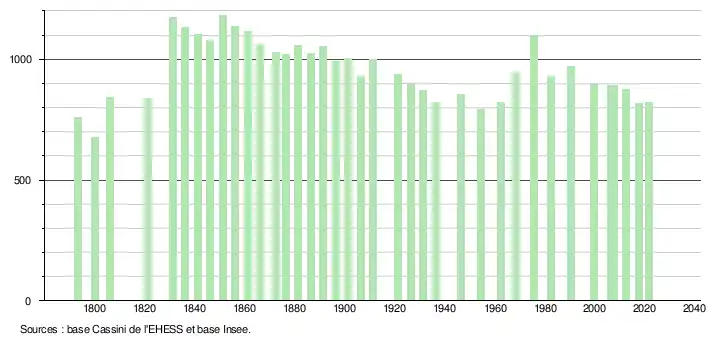 L'évolution du nombre d'habitants est connue à travers les recensements de la population effectués dans la commune depuis 1793. Pour les communes de moins de 10 000 habitants, une enquête de recensement portant sur toute la population est réalisée tous les cinq ans, les populations légales des années intermédiaires étant quant à elles estimées par interpolation ou extrapolation[12]. Pour la commune, le premier recensement exhaustif entrant dans le cadre du nouveau dispositif a été réalisé en 2007[13].