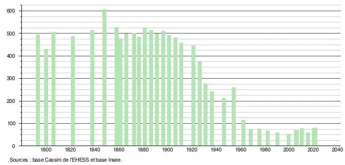 L'évolution du nombre d'habitants est connue à travers les recensements de la population effectués dans la commune depuis 1793. Pour les communes de moins de 10 000 habitants, une enquête de recensement portant sur toute la population est réalisée tous les cinq ans, les populations légales des années intermédiaires étant quant à elles estimées par interpolation ou extrapolation[18]. Pour la commune, le premier recensement exhaustif entrant dans le cadre du nouveau dispositif a été réalisé en 2005[19].