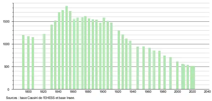 L'évolution du nombre d'habitants est connue à travers les recensements de la population effectués dans la commune depuis 1793. Pour les communes de moins de 10 000 habitants, une enquête de recensement portant sur toute la population est réalisée tous les cinq ans, les populations légales des années intermédiaires étant quant à elles estimées par interpolation ou extrapolation[17]. Pour la commune, le premier recensement exhaustif entrant dans le cadre du nouveau dispositif a été réalisé en 2008[18].