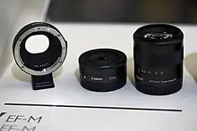 La gamme d'objectifs EF-M de Canon est encore relativement réduite, avec seulement huit objectifs sortis en six ans d'existence[13]. Il est cependant possible d'utiliser les très nombreuses optiques des montures EF et EF-S grâce à la bague d'adaptation EF-EOS M[14].