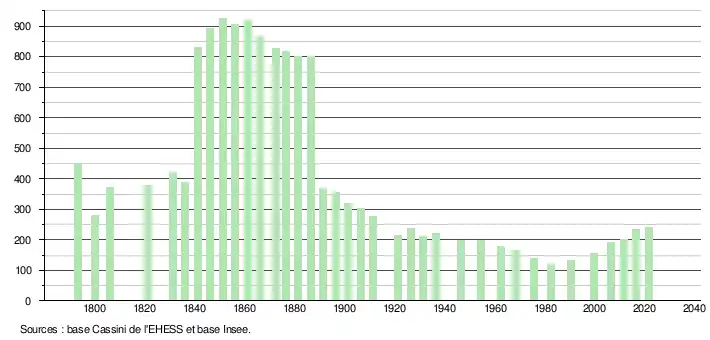 L'évolution du nombre d'habitants est connue à travers les recensements de la population effectués dans la commune depuis 1793. Pour les communes de moins de 10 000 habitants, une enquête de recensement portant sur toute la population est réalisée tous les cinq ans, les populations légales des années intermédiaires étant quant à elles estimées par interpolation ou extrapolation[32]. Pour la commune, le premier recensement exhaustif entrant dans le cadre du nouveau dispositif a été réalisé en 2006[33].