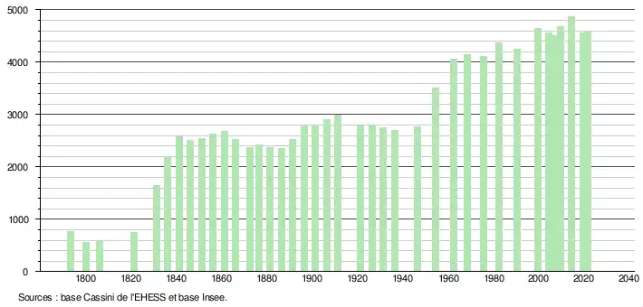 L'évolution du nombre d'habitants est connue à travers les recensements de la population effectués dans la commune depuis 1793. Pour les communes de moins de 10 000 habitants, une enquête de recensement portant sur toute la population est réalisée tous les cinq ans, les populations légales des années intermédiaires étant quant à elles estimées par interpolation ou extrapolation[39]. Pour la commune, le premier recensement exhaustif entrant dans le cadre du nouveau dispositif a été réalisé en 2004[40].