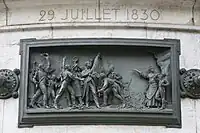 Le piédestal de pierre est ceint de douze hauts-reliefs en bronze, œuvres de Léopold Morice[6], reliés par des rosaces, disposés à la hauteur du regard des passants. Ils constituent une chronologie d'événements marquant l'histoire de la République française, entre 1789 et 1880 :