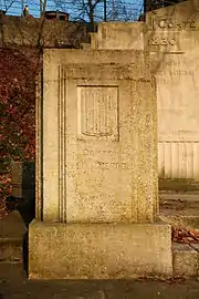 Il est précédé de deux courts piliers de section carrée portant, à gauche, le blason de la maison de Merode et le nom du comte Félix de Merode et, à droite, le blason et le nom de sa seconde épouse, Philippine de Grammont.