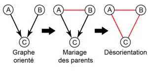 Pour moraliser le graphe, on doit marier les parents d'un même sommet, puis désorienter le graphe[1]. Cette étape peut s'effectuer en temps linéaire .