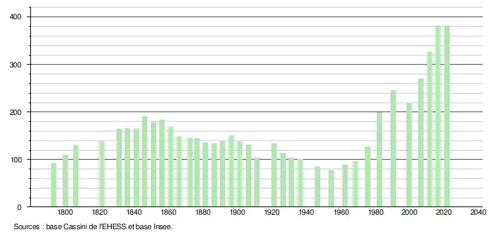 L'évolution du nombre d'habitants est connue à travers les recensements de la population effectués dans la commune depuis 1793. Pour les communes de moins de 10 000 habitants, une enquête de recensement portant sur toute la population est réalisée tous les cinq ans, les populations légales des années intermédiaires étant quant à elles estimées par interpolation ou extrapolation[19]. Pour la commune, le premier recensement exhaustif entrant dans le cadre du nouveau dispositif a été réalisé en 2006[20].