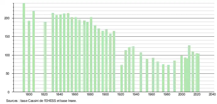 L'évolution du nombre d'habitants est connue à travers les recensements de la population effectués dans la commune depuis 1793. Pour les communes de moins de 10 000 habitants, une enquête de recensement portant sur toute la population est réalisée tous les cinq ans, les populations légales des années intermédiaires étant quant à elles estimées par interpolation ou extrapolation[16]. Pour la commune, le premier recensement exhaustif entrant dans le cadre du nouveau dispositif a été réalisé en 2004[17].