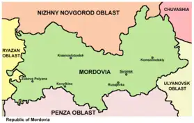 La Mordovie est voisine des oblasts de Nijni Novgorod au nord, de Riazan à l'ouest, de Penza au sud et d'Oulianovsk à l'est, ainsi que de la Tchouvachie au nord-est.