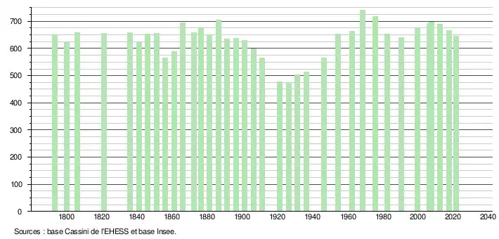 L'évolution du nombre d'habitants est connue à travers les recensements de la population effectués dans la commune depuis 1793. Pour les communes de moins de 10 000 habitants, une enquête de recensement portant sur toute la population est réalisée tous les cinq ans, les populations légales des années intermédiaires étant quant à elles estimées par interpolation ou extrapolation[13]. Pour la commune, le premier recensement exhaustif entrant dans le cadre du nouveau dispositif a été réalisé en 2007[14].