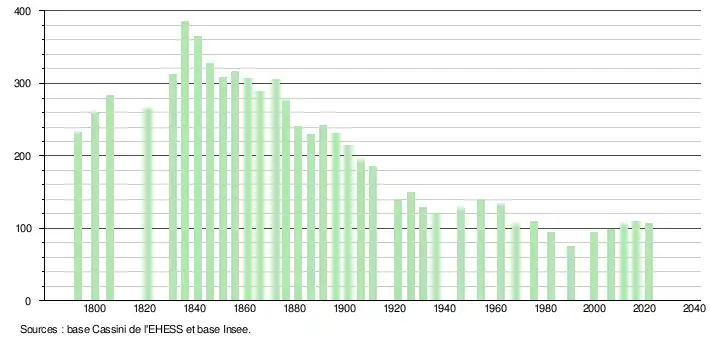 L'évolution du nombre d'habitants est connue à travers les recensements de la population effectués dans la commune depuis 1793. Pour les communes de moins de 10 000 habitants, une enquête de recensement portant sur toute la population est réalisée tous les cinq ans, les populations légales des années intermédiaires étant quant à elles estimées par interpolation ou extrapolation[14]. Pour la commune, le premier recensement exhaustif entrant dans le cadre du nouveau dispositif a été réalisé en 2006[15].