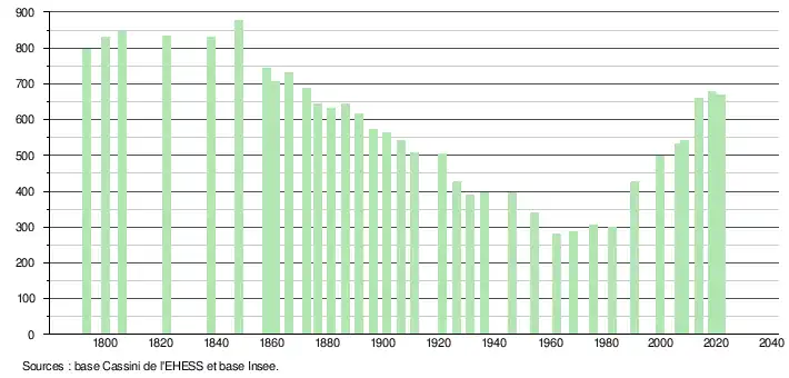L'évolution du nombre d'habitants est connue à travers les recensements de la population effectués dans la commune depuis 1793. Pour les communes de moins de 10 000 habitants, une enquête de recensement portant sur toute la population est réalisée tous les cinq ans, les populations légales des années intermédiaires étant quant à elles estimées par interpolation ou extrapolation[18]. Pour la commune, le premier recensement exhaustif entrant dans le cadre du nouveau dispositif a été réalisé en 2008[19].