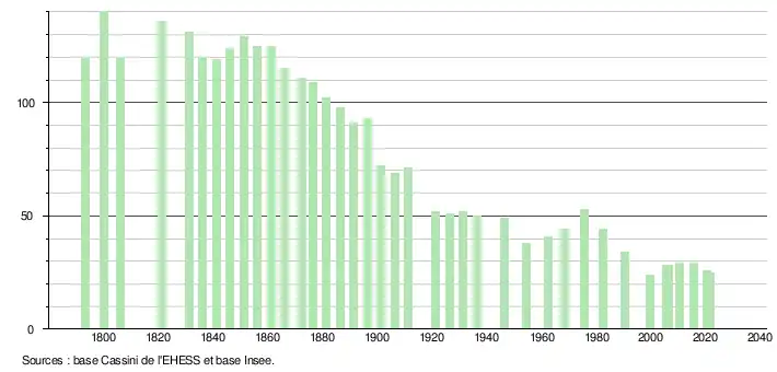 L'évolution du nombre d'habitants est connue à travers les recensements de la population effectués dans la commune depuis 1793. Pour les communes de moins de 10 000 habitants, une enquête de recensement portant sur toute la population est réalisée tous les cinq ans, les populations légales des années intermédiaires étant quant à elles estimées par interpolation ou extrapolation[17]. Pour la commune, le premier recensement exhaustif entrant dans le cadre du nouveau dispositif a été réalisé en 2005[18].